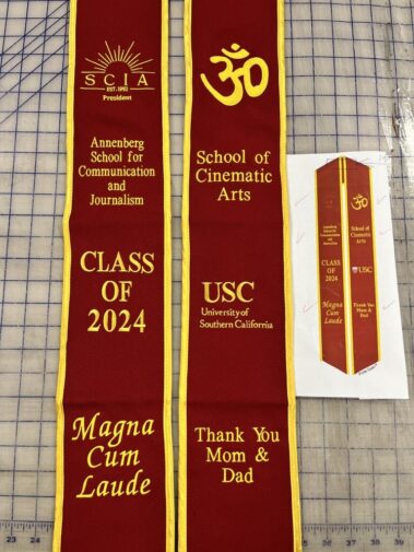 We offer Custom Graduation Sash Embroidery here at Spectracolor in Simi Valley, CA. Many graduates from CSUN, UCLA, USC and many other colleges come get their “one of a kind” custom graduation stole / sash embroidered by us.